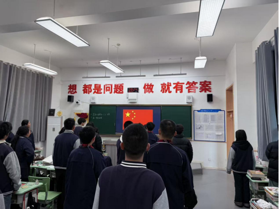 仪式在雄壮的中华人民共和国国歌中正式开启,全体师生肃立注目,面向国旗行注目礼,鲜艳的五星红旗在室内庄严升起,爱国之情与责任之心在师生心中交融激荡,现场洋溢着庄重肃穆的氛围。