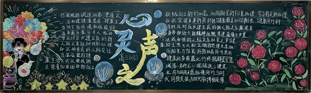各班围绕“心理健康知识科普”“良好人际交往技巧”“健康生活方式”“班级正能量加油站”等板块,精心设计、认真绘制,创作出一批内容丰富、设计精美、富有创意的黑板报作品。同学们在创作过程中不仅提升了审美与协作能力,更在潜移默化中学习了心理健康知识,增强了心理调适能力。