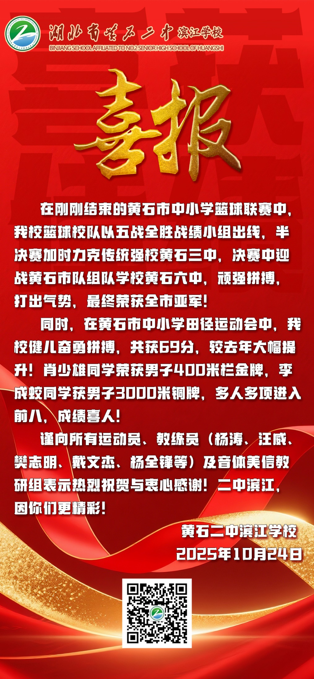 在刚刚落幕的市田径运动会及黄石市第十二届运动会中小学篮球联赛中,我校学子顽强拼搏,锐意进取,取得了辉煌的成绩,捷报频传,特此向全校师生报喜!