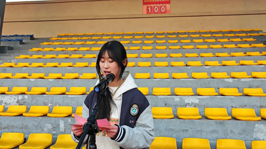 1月8日下午,距离2026年体育高考仅剩100天之际,高三年级体育生“百日砺剑 双线夺魁”百日誓师大会在学校田径场隆重举行。大会由学校德体卫艺处主任桂林晖主持,学校领导校长冯朝,副校长陈诚、毛弟汉,体育教练团队及全体高一、高二、高三体育生齐聚一堂,共同吹响冲刺高考的冲锋号。